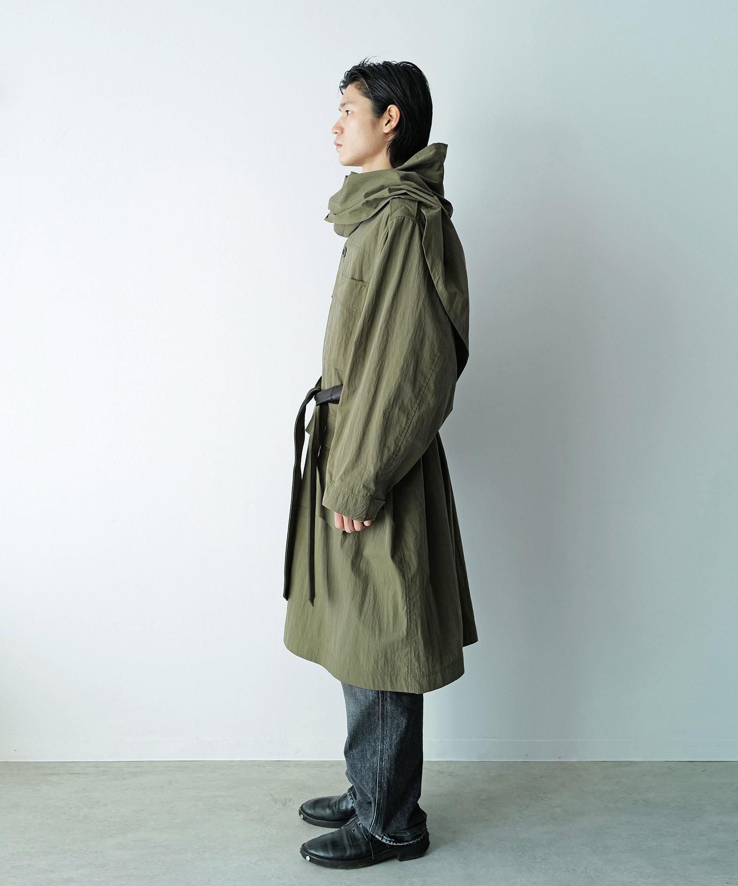 DESCRIPTION 着脱可能なフード型ストール付きの2WAYミリタリーコート。 ジャングルファティーグジャケットと、M-65コートから派生したディテールを織り交ぜ再解釈し、ブランド独自のアレンジを加えて生まれたアイテム。 襟ぐりのボタンで取り外し可能なフード型ストールが付き、ノーカラーコートでもスタイリングが可能です。 ウエストベルトの片面にはレザーが組み込みまれ、裏表をスイッチすることでスタイリングにアクセントを加えることができます。 生地には、ピーチ加工(微起毛)を施したコットン/ナイロンの糸で織られたリップストップ素材を使用し、シルエットを演出するためにも重要となるハリを保ちつつ、軽快な着心地をお楽しみいただけます。 COMMENT 某雑誌でも取り上げられ、25SSシーズン人気を博した「HAOLI MIRITARY JACKET : 」が今季はコートスタイルでリリース。 これは展示会で見たときからかっこいいと思っていました。 ミリタリー由来のアイテムですが無骨さはなく、ファッショナブルで楽しい一着です。 遊びはあるけど、はみ出しすぎずなバランス感覚が優秀でデイリーに着れます。 首回りとベルトの変化で、かなり着こなしのバリエーションが広がりますし、薄手でシーズンを越えて使い勝手が良いので、秋、着込んで冬、春とぜひ楽しんでください。 SIZE(cm) M : Length 113.5, Shoulder 47.5, Width 94, Sleeve 64 MODEL : 176cm, 60kg and wears a size M. MATERIAL 70% COTTON, 30% NYLON