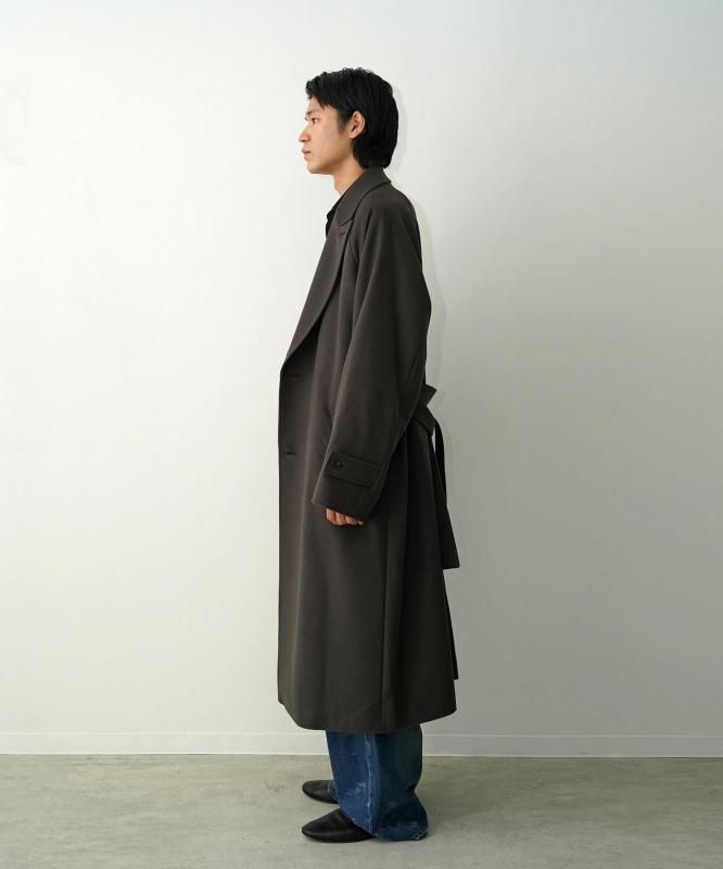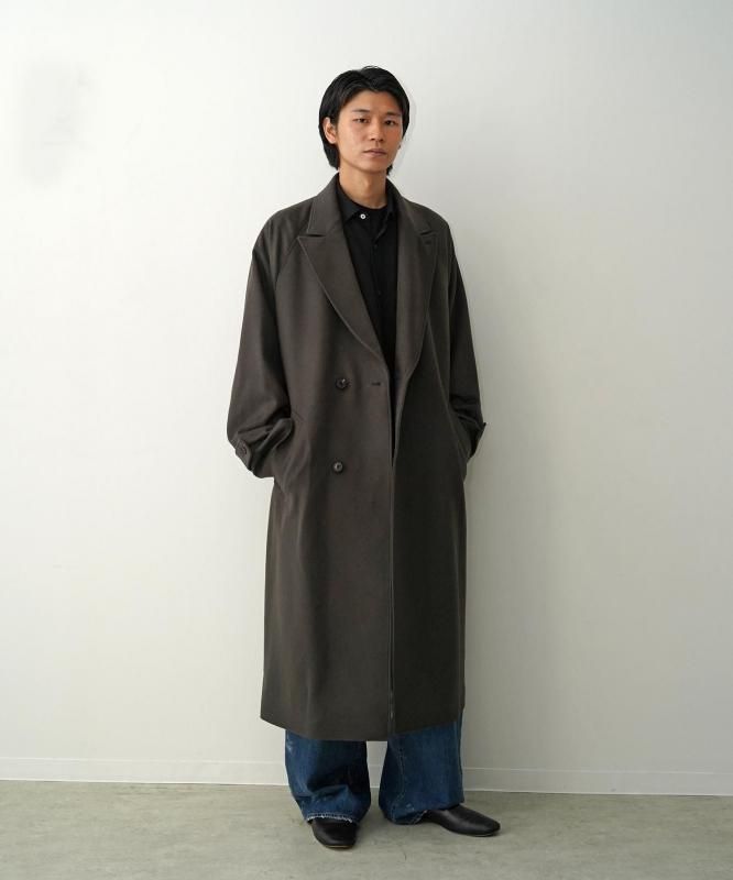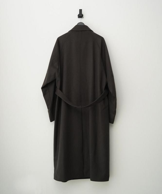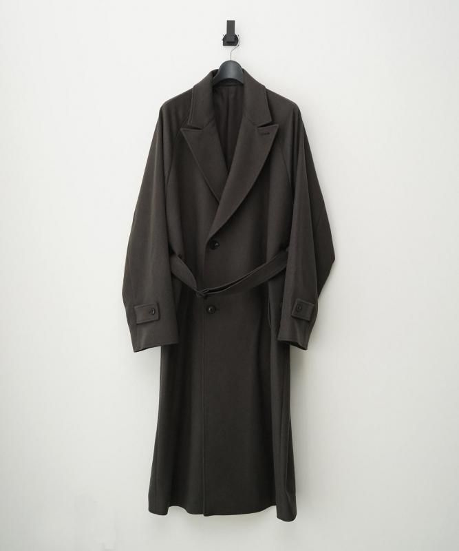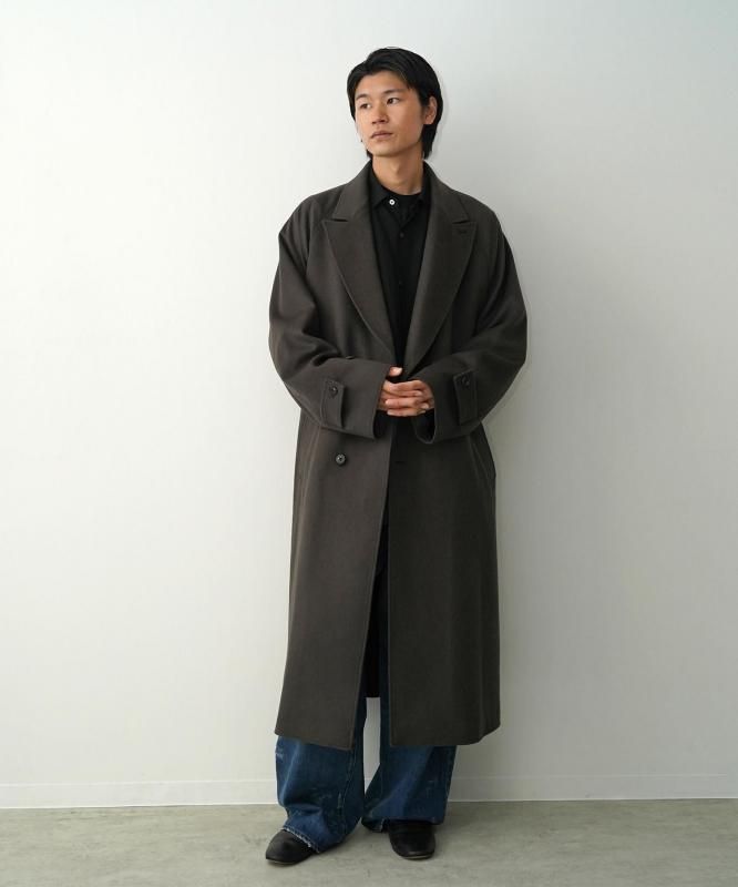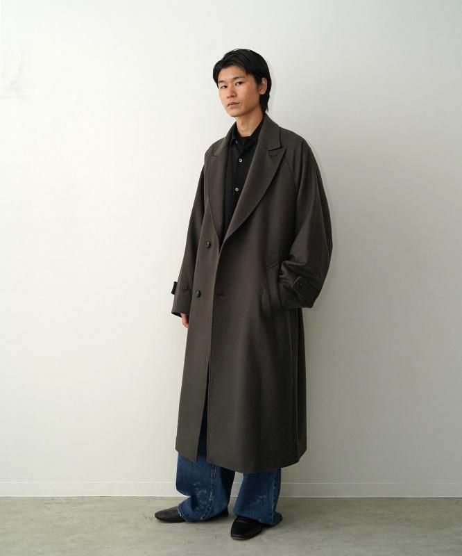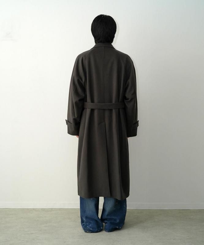 DESCRIPTION 非常に柔らかく、膨らみのある内蒙古産のカシミヤをブレンドしたウールカシミヤビーバーを使用したピークトラペルコート。 袖はラグランスリーブ、ウエストはレザー紐が施される。 SIZE(cm) S : Length124 Width64 Raglan sleeve length88 M :Length126 Width66 Raglan sleeve length90 MODEL : 182cm, 61kg and wears a size S. MATERIAL 70%WOOL,30%CASHMERE