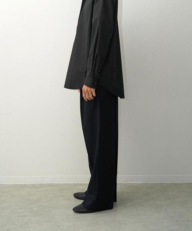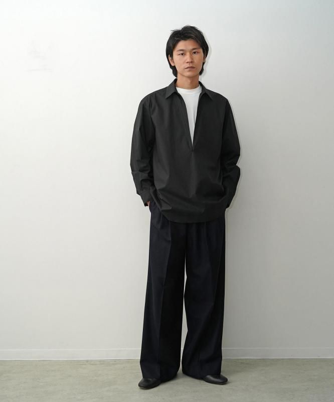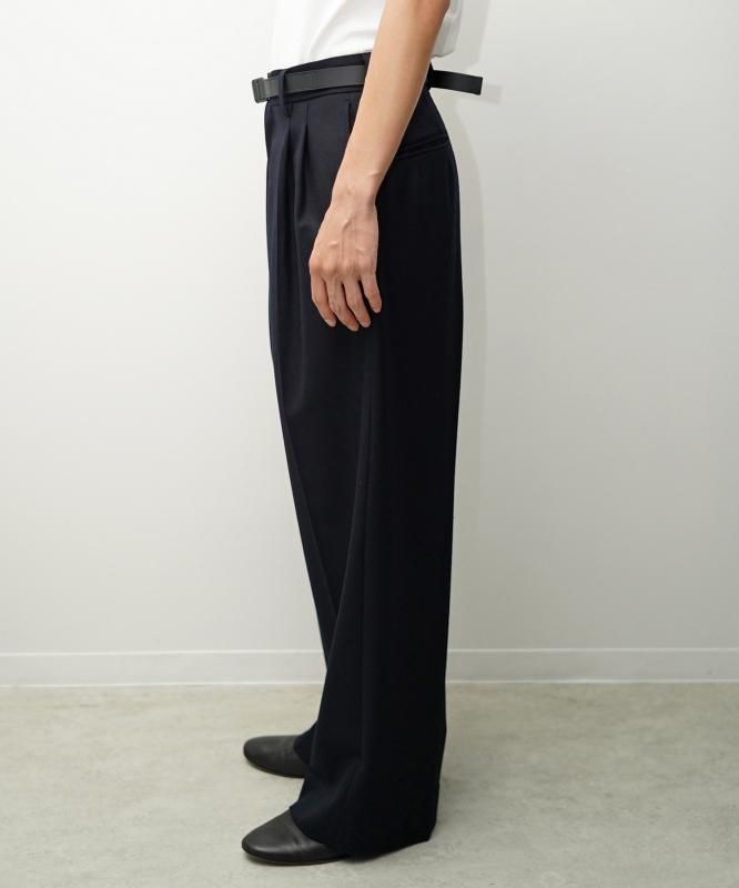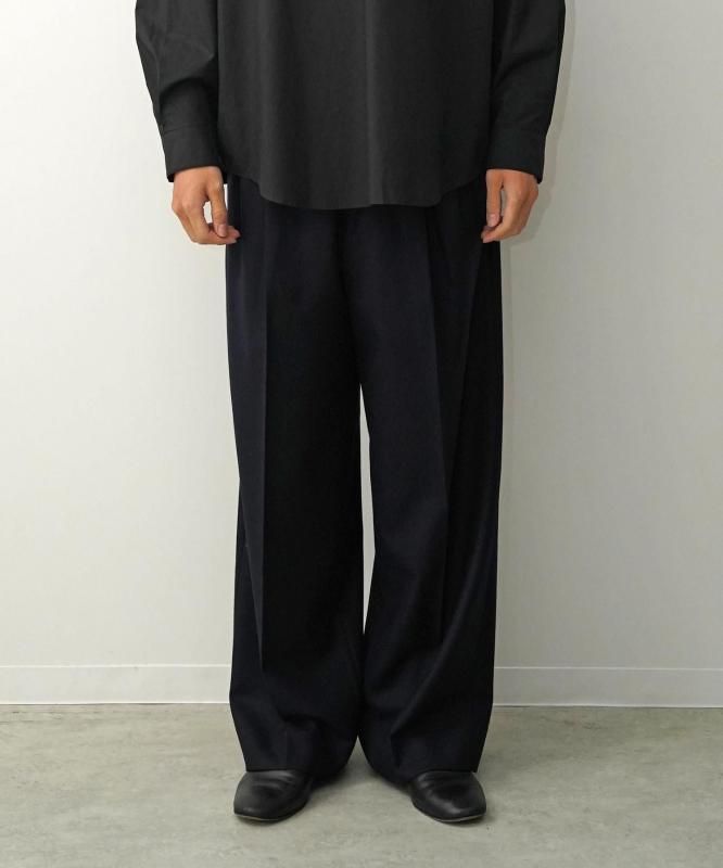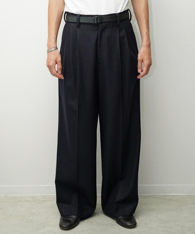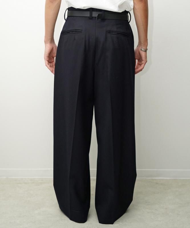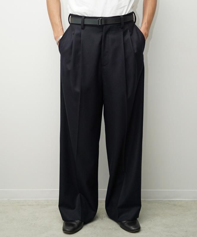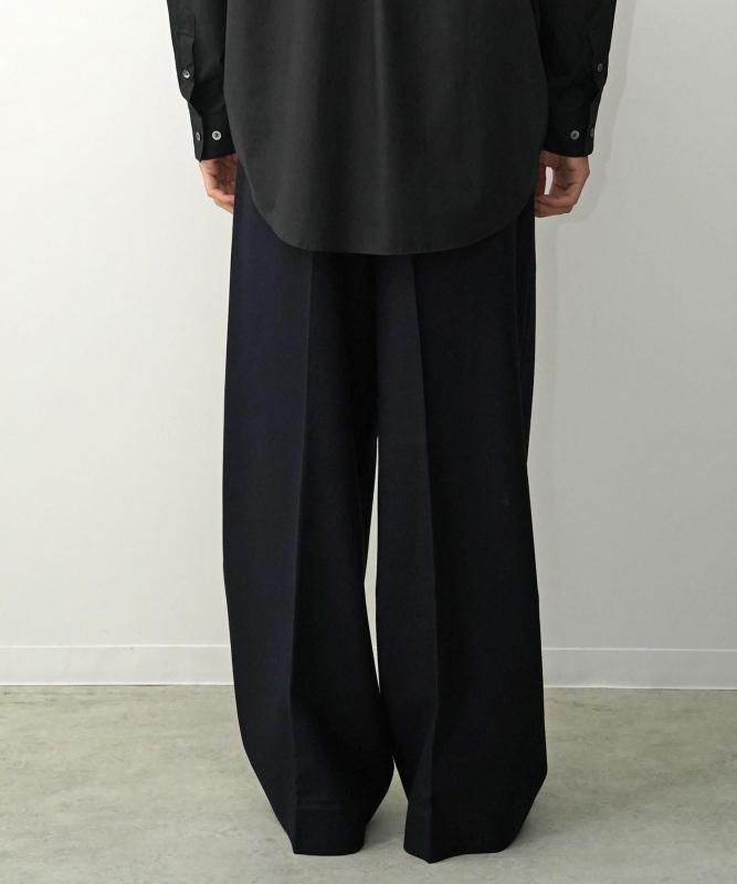 DESCRIPTION わたり幅から裾幅までワイドに設定したツータックトラウザーズ。 腰回りはすっきりとしたフィット感になるよう調整し、ワイドなシルエットながら上品な、エレガントなバランスに仕上がっている。 SIZE(cm) S : Waist80 Rise35 Inseam76 Thigh36 Leg Opening29 MODEL : 182cm, 61kg and wears a size S. MATERIAL 100%WOOL