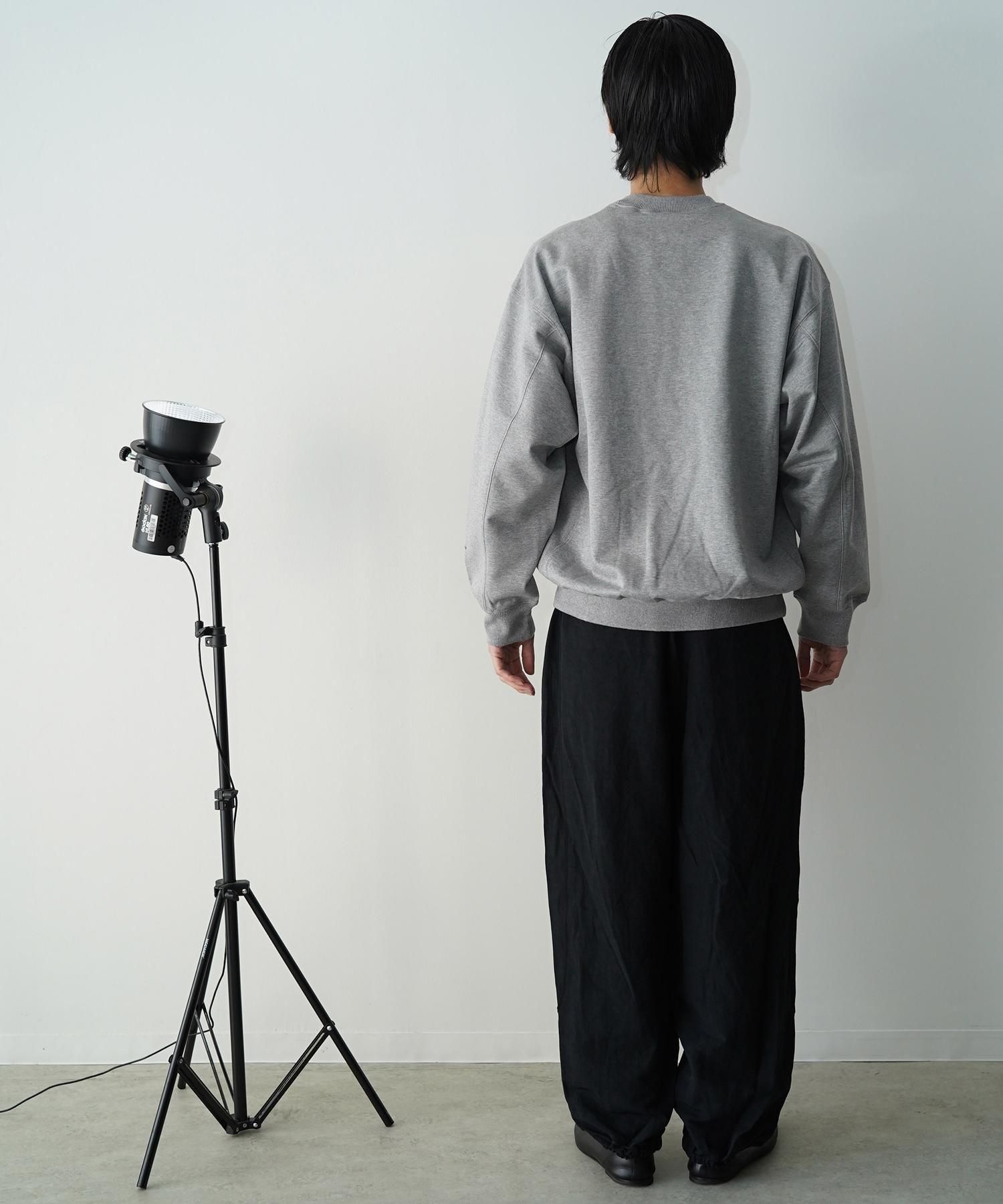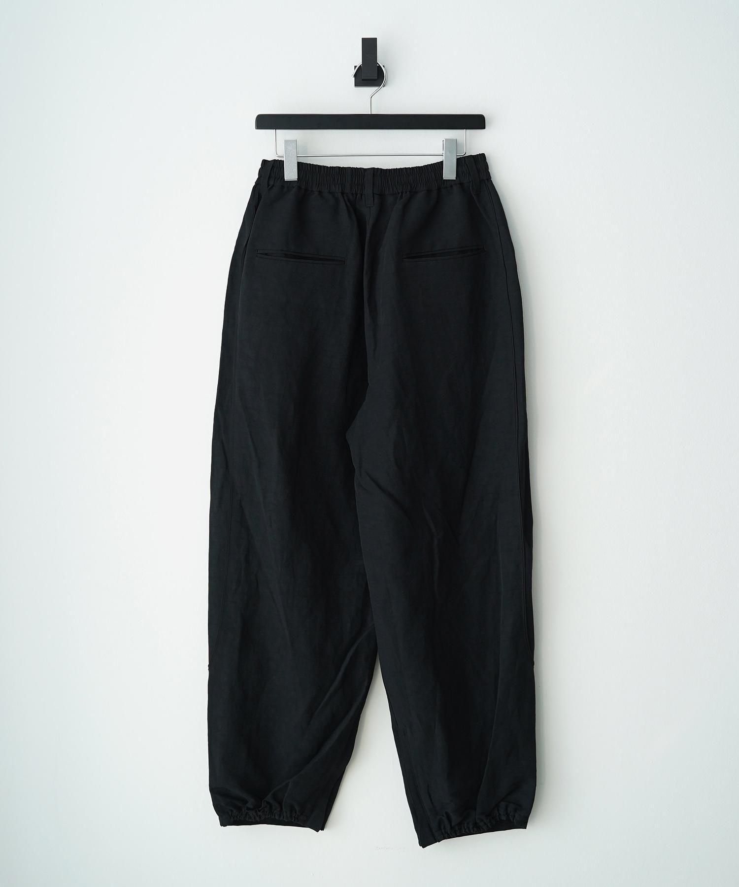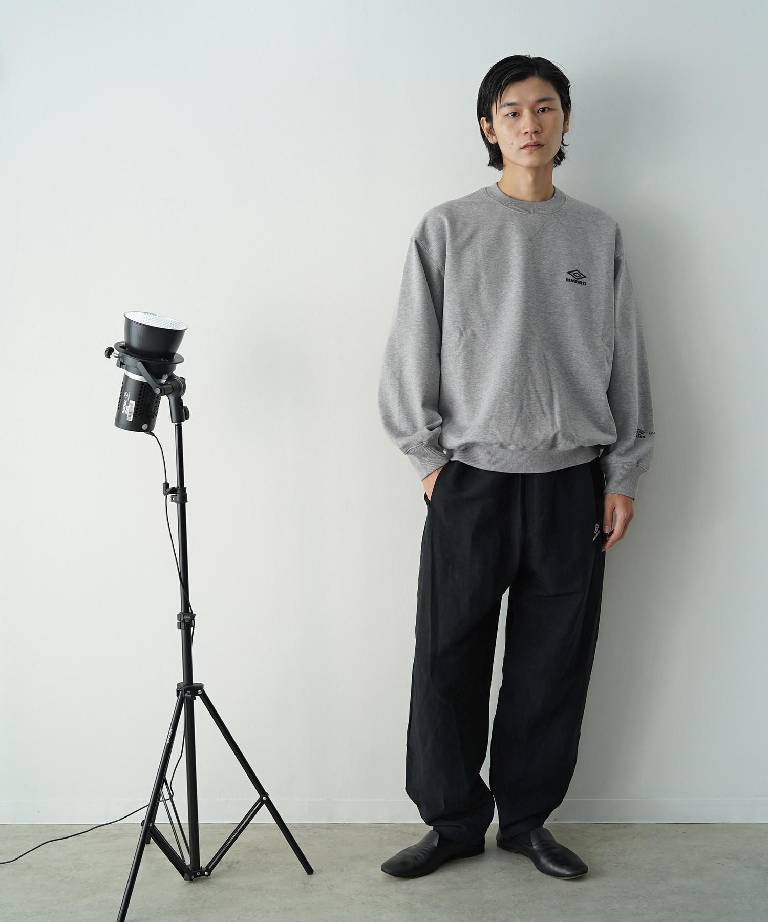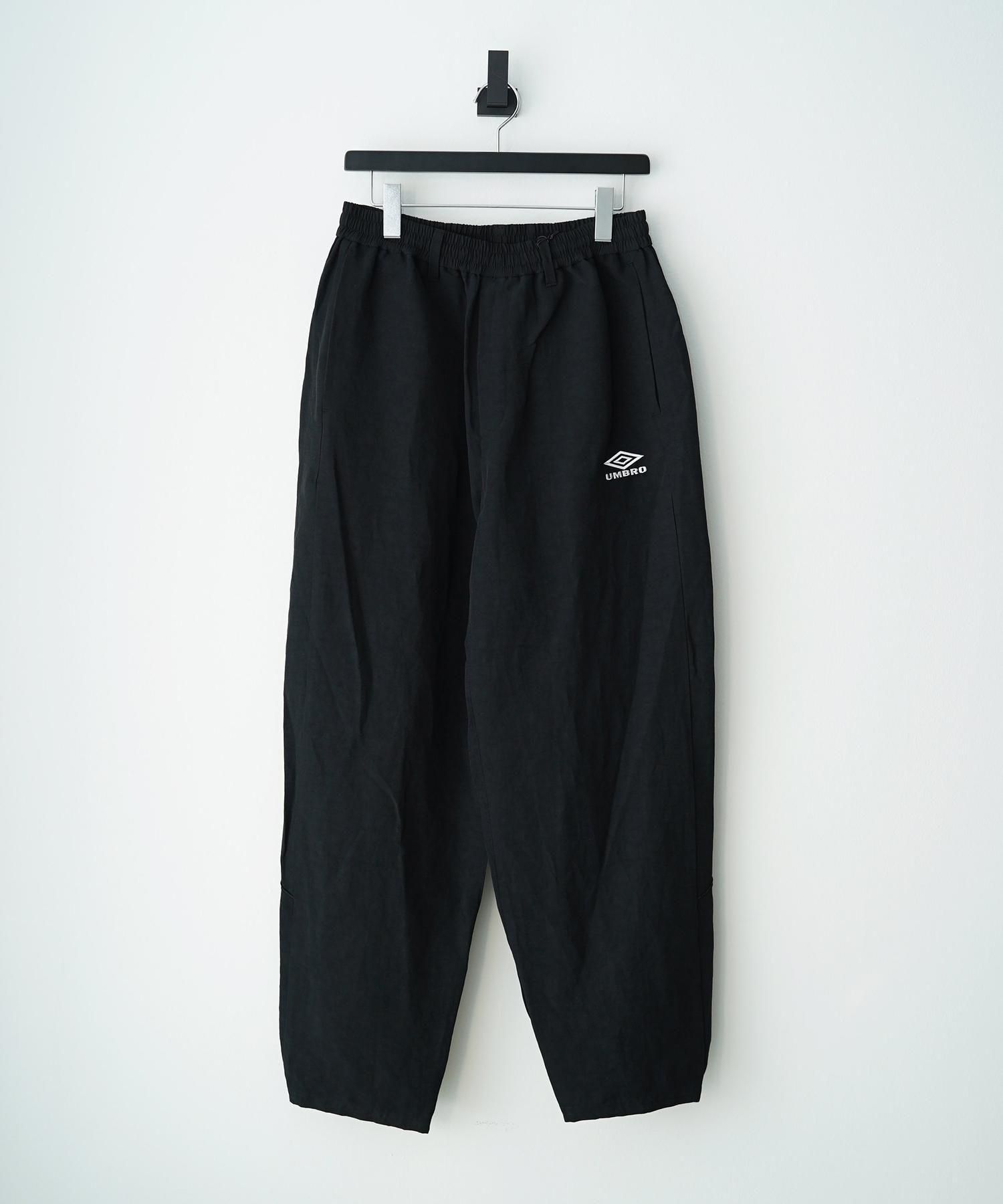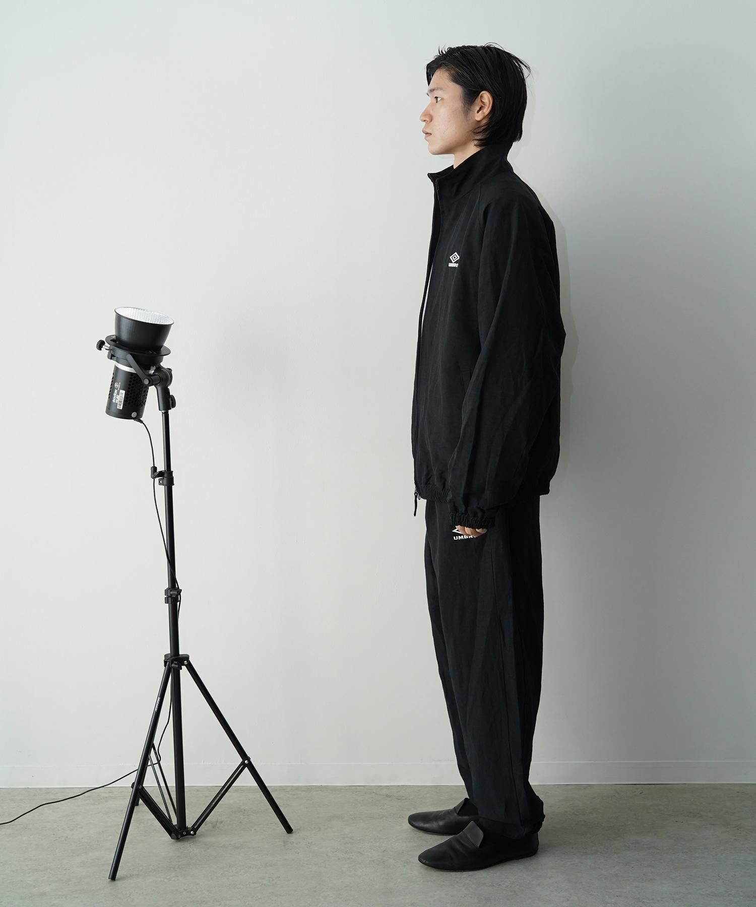 DESCRIPTION LINEN / NYLON TRACK TROUSERS — ssstein × UMBRO 同素材で仕立てたトラックトラウザー。 軽さだけでは語れない深みと、洗練された佇まいを纏う一本。 リネンの張りとナイロンの弾性を併せ持つ交織素材は、 洗い+撥水加工を経て、静かに光る質感と柔和な表情を獲得。 脚線に沿うカーブのハギ、極めて繊細なパイピング、 両玉縁のピスポケット…細部に宿る職人技が、佇まいに格を与えます。 左ポケットにあしらわれたUMBROロゴが、余白の中に控えめな強さを刻む。 シーズンを問わず、自身のスタイルに静かな高揚をもたらす一本です。 SIZE(cm) S : Waist63-96 Rise36 Inseam70 Thigh35 Leg Opening18-23 M : Waist67-97 Rise36 Inseam72 Thigh36 Leg Opening19-24 MODEL : 182cm, 61kg and wears a size M. MATERIAL 54% LINEN, 46% NYLON