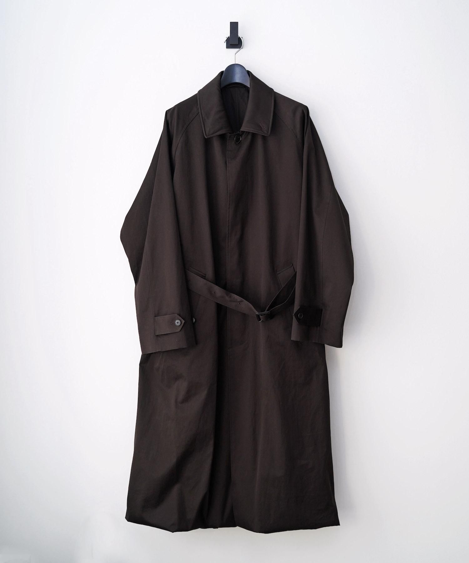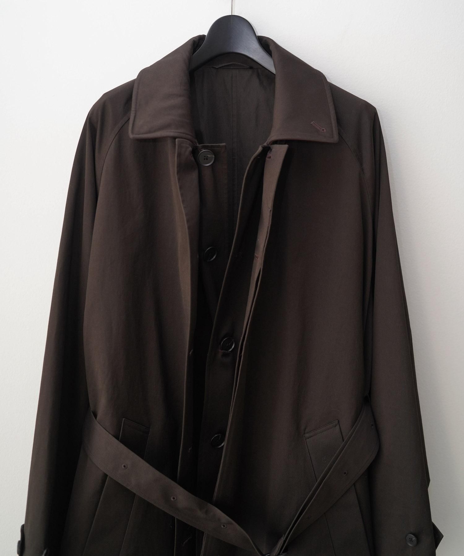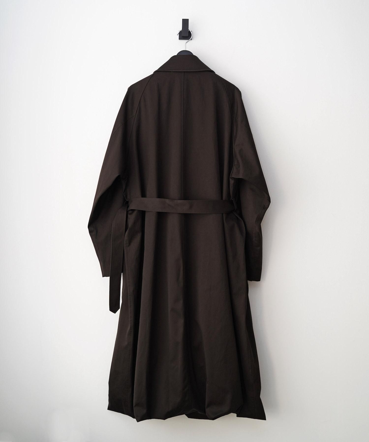 DESCRIPTION 外側のコートの裾から内側のロングベストの裾に繋がるように設定したレイヤードコート。 裾部分のシルエット、衿・ラペル部分の重なりの印象が強く残るよう、他のエッセンスを極力削ぎ落としていく方向性で製作。 襟裏にはカウレザーを施し、素材感、色味のコントラストを出している。 SIZE(cm) S : Length 125 , Width 70 , Raglan sleeve length 90 MATERIAL 100%COTTON