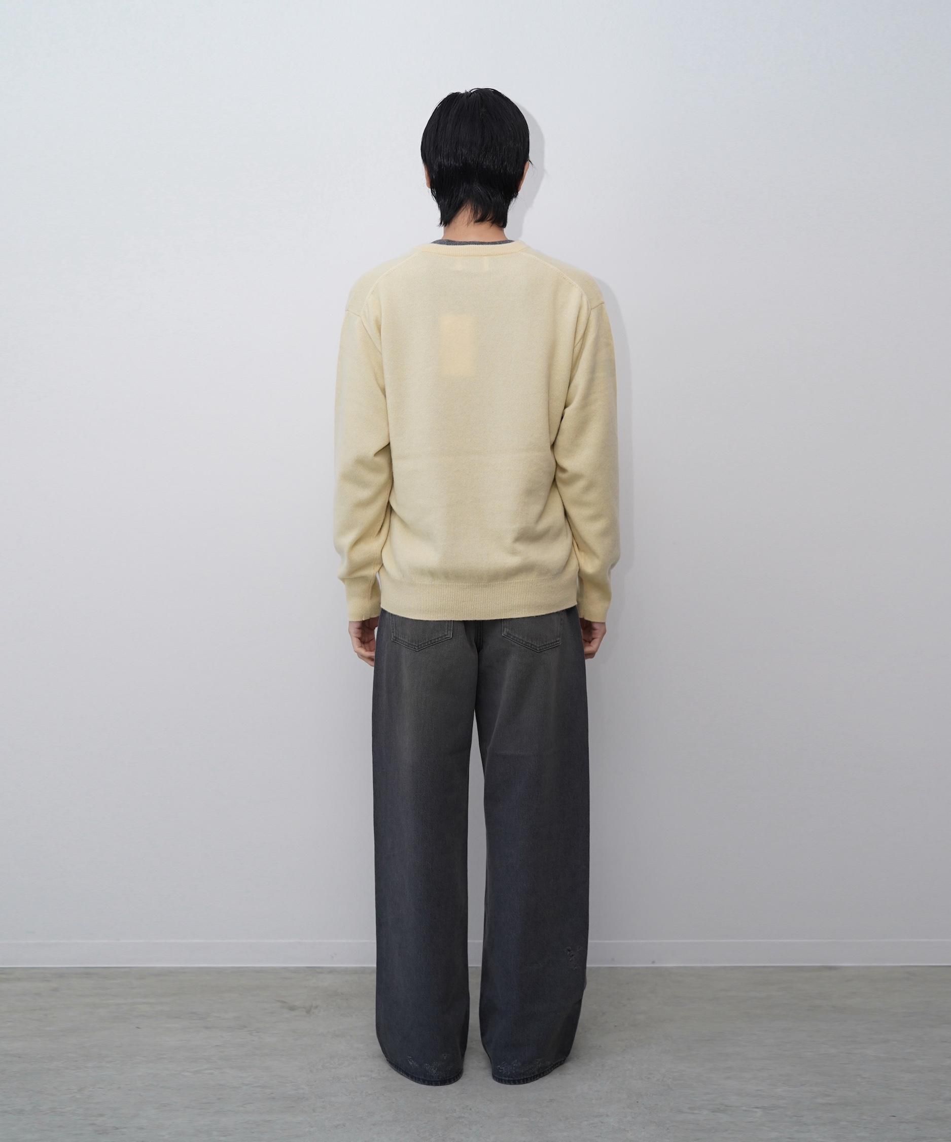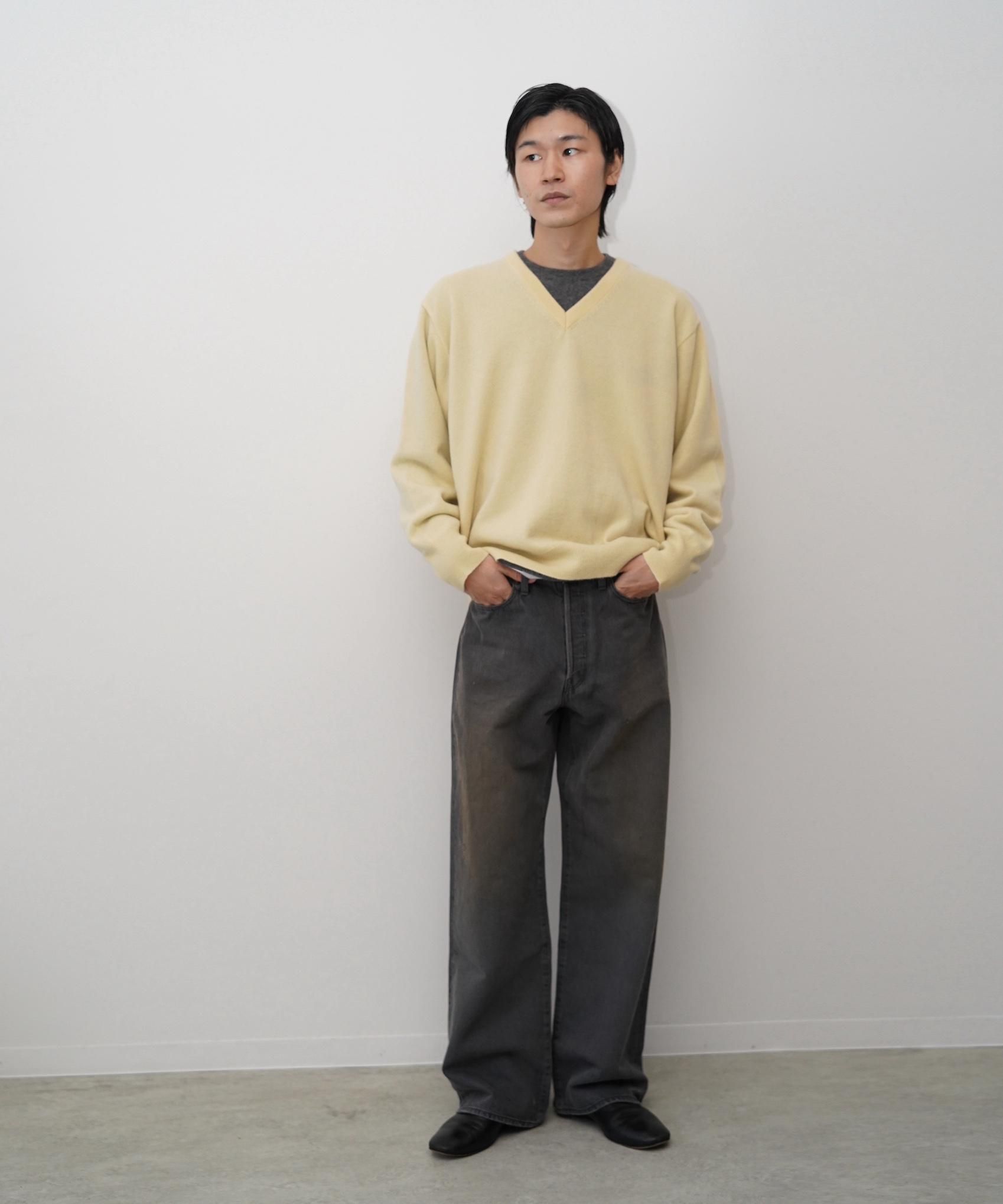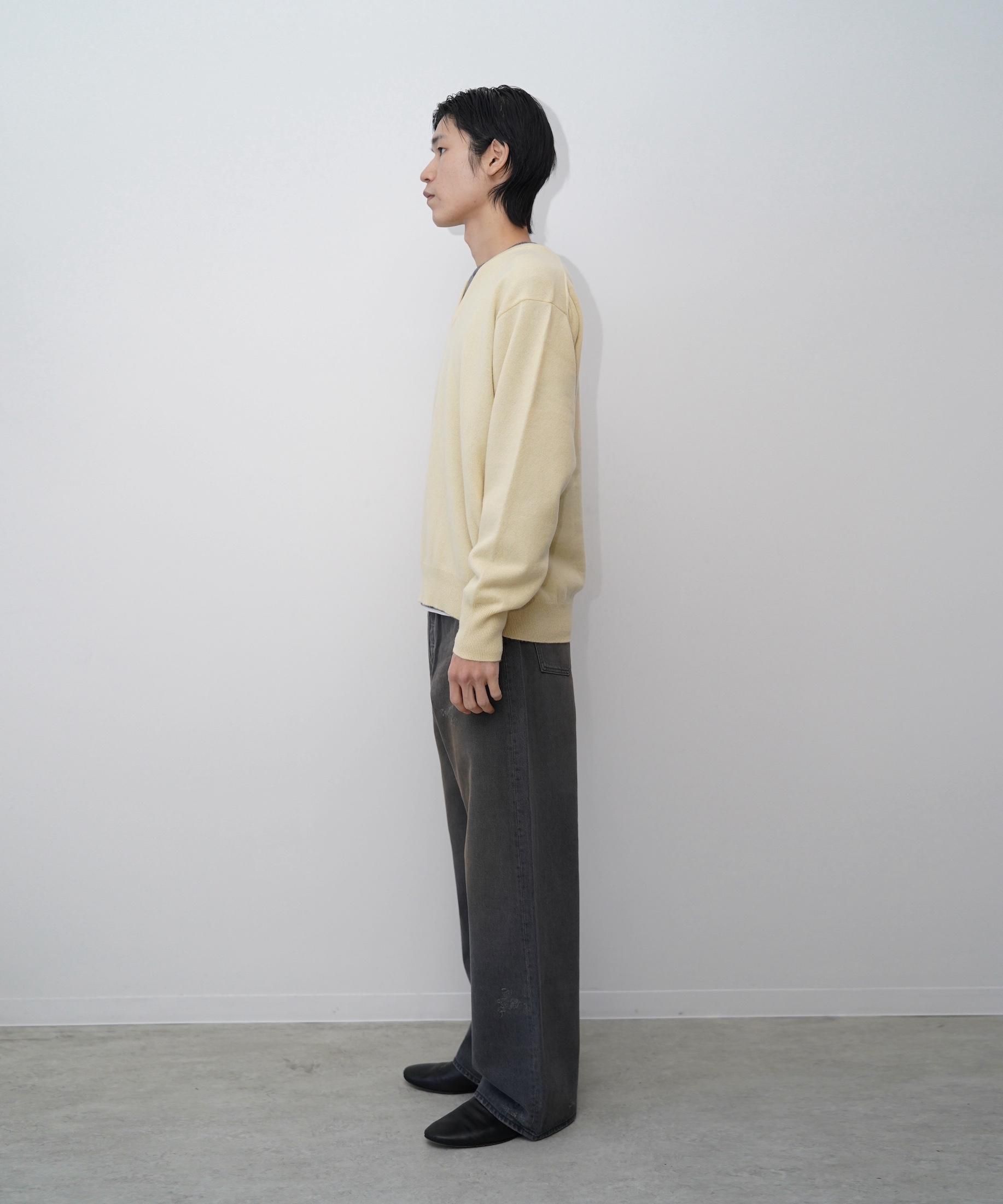 ストーンウォッシュ、ブリーチ、オーバーダイ、吹付け、手作業によるダメージ感等様々な加工過程を施し奥行きのあるデニムの表情を出している。