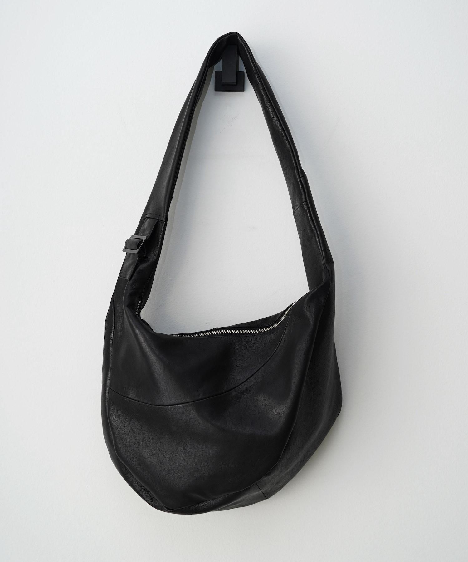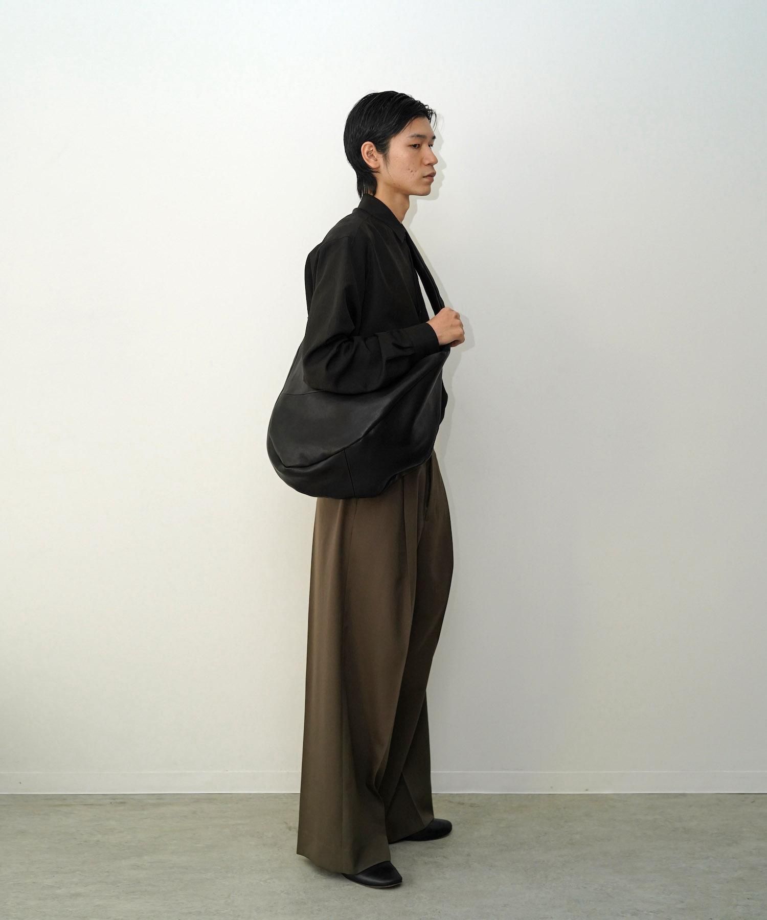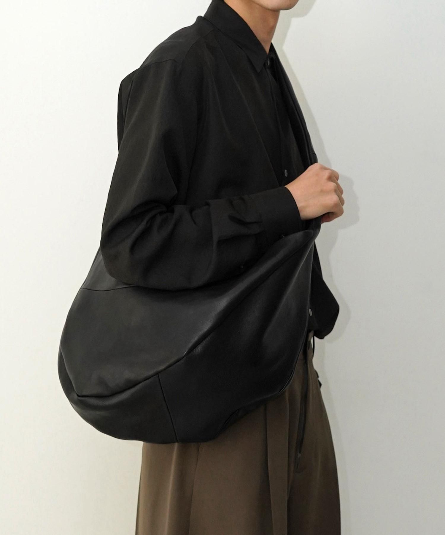 DESCRIPTION ゴートレザーを使用したツイストレザーショルダーバッグ。 ショルダー内側にレザーベルトを施し、長さを調整することでショルダー部分にギャザーが寄るように設計。 SIZE(cm) ONE : Height 32 , Width 54 , Depth 15 , Handle length 52-87 MATERIAL GOAT LEATHER